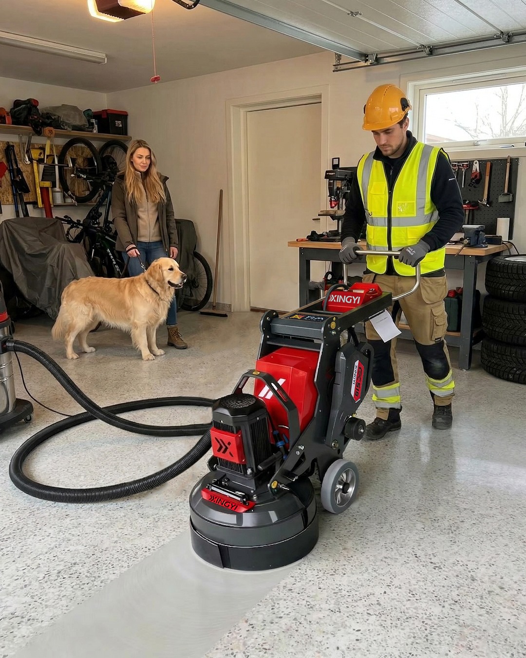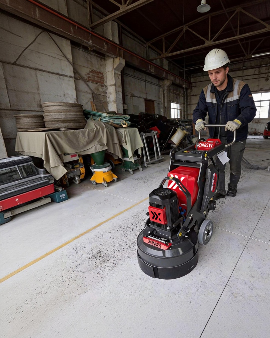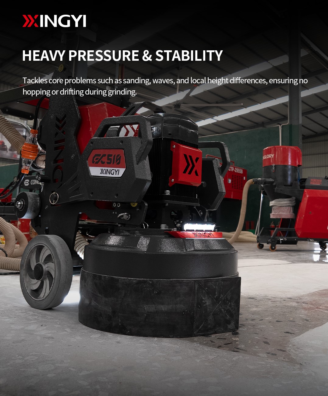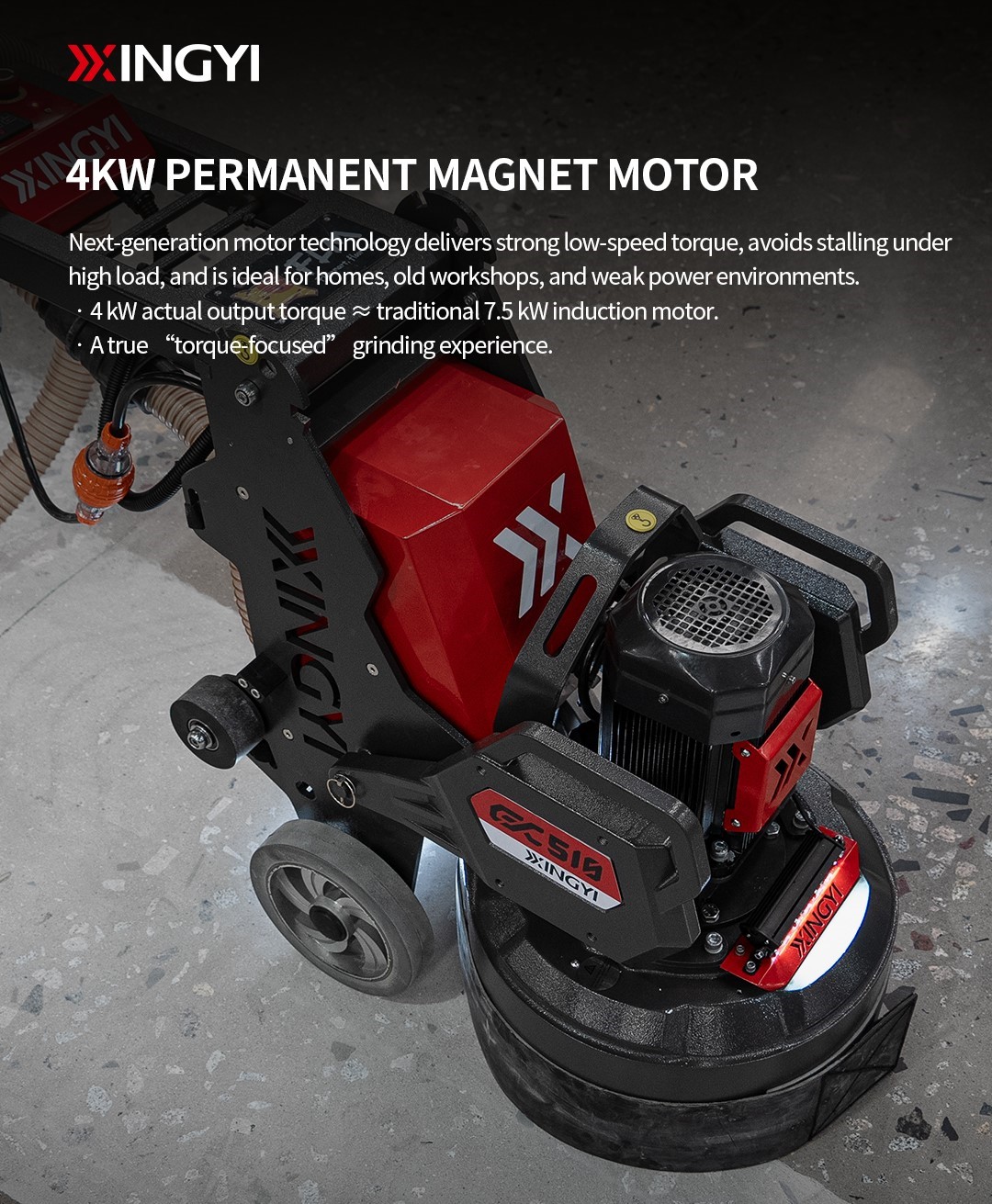 XINGYI GX510 220V Planetary Concrete Floor Grinder Machine for Coating Removal & Prepping GX510 220V Planetary Floor Grinder The Professional Grinder That Chews Through Tough Floors—Even on Household Power Co-developed with FLM/FLOORMART, the GX510 is our second-generation planetary floor grinder built for demanding jobsites. Designed to handle uneven, damaged, and mixed-use surfaces, it delivers the perfect balance of stability, torque, power compatibility, and portability. More