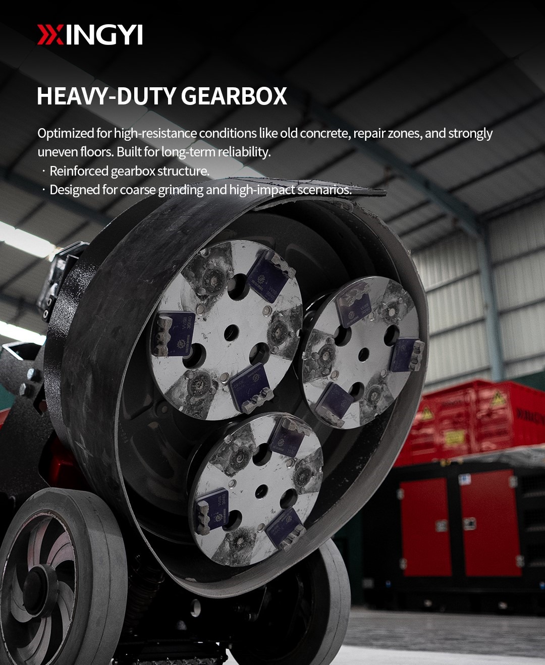 GX750 Heavy-Duty Concrete Grinding Machine GX 750 Planetary Concrete GRINDING MACHINE GX750 is a heavy-duty equipment for your polishing project, Thanks to XINGYI dual Alloy gearbox casting technology, the machine has 3 planetary heads with very low maintenance. The stronger welded machine body with friendly operation handle and 2 positions weight iron to adjust the pressure when you are working. All motor and inverter are from the newest technology special for XINGYI grinding machine. More